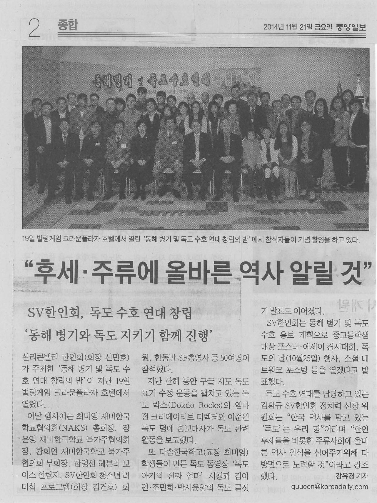 [중앙일보] 독도 지키기 운동 참여 11월 19일 크라운플라자 호텔에서 개최된 독도 지키기 운동에 독도 동영상 '독도 아기의 진짜 엄마'을 만든 대한민국 반의 학생들이 함께 했습니다. Prev Next
