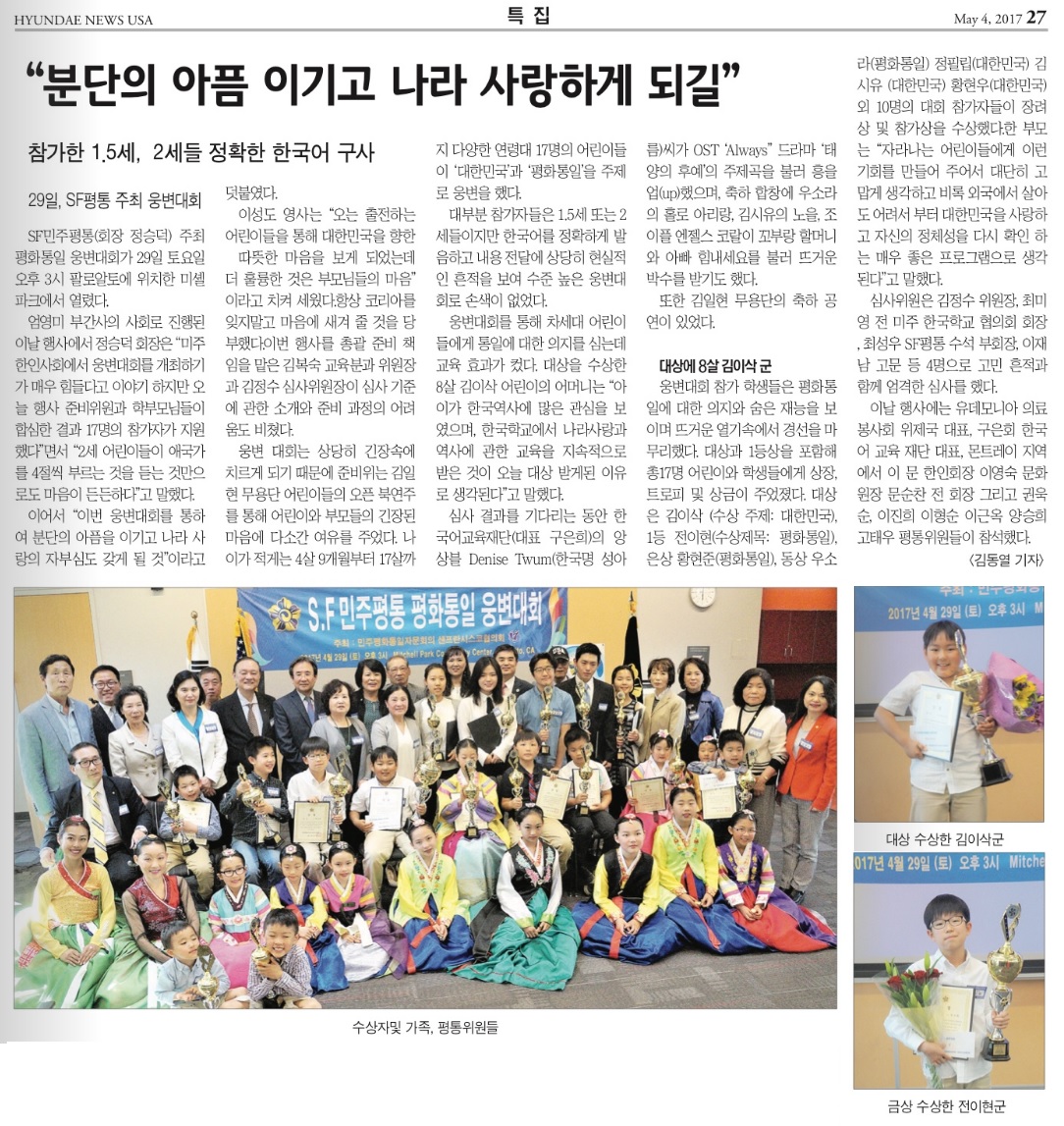 [주간현대] SF 평통 웅변대회 2017년 5월 4일 주간현대에 게재된 SF 민주평통 주최 평화통일 웅변대회에 관한 기사입니다. 본교에서 대표로 참석한 두 학생이 아래와 같이 수상하였습니다. 대상: 김이삭 금상: 전이현 Prev Next