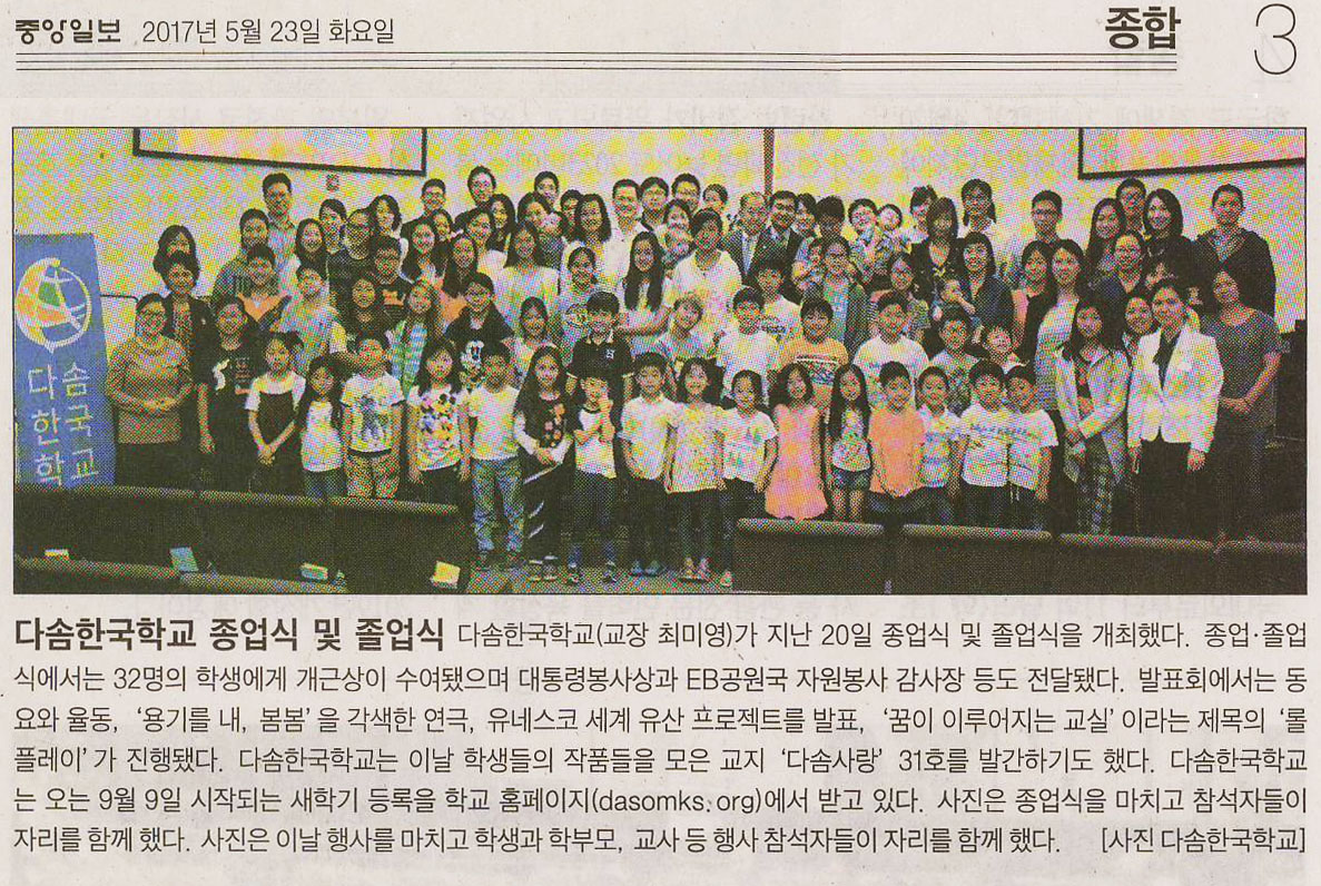 지난 5월 20일에 있었던 다솜한국학교 2016-2017학년도 종강식 및 졸업식에 관한 중앙일보 기사입니다.