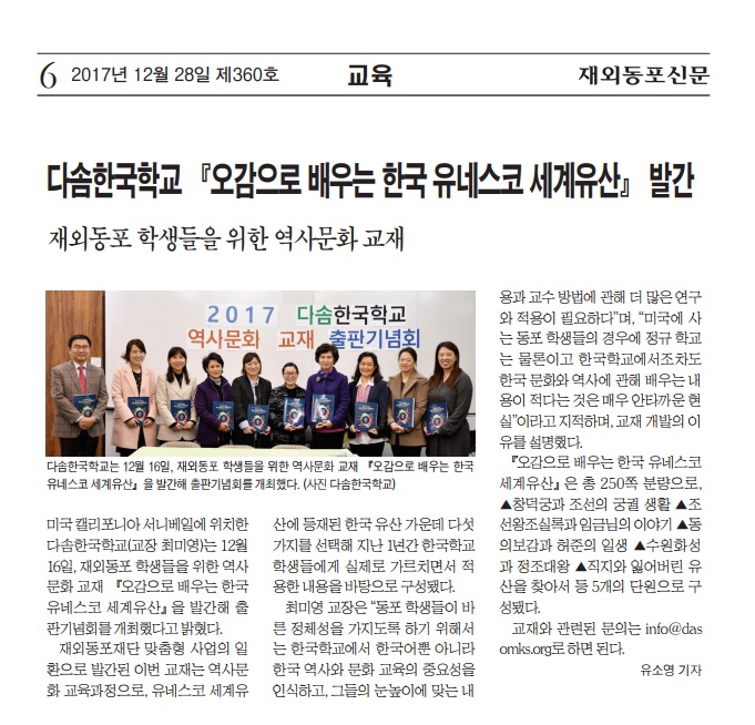 다솜한국학교 『오감으로 배우는 한국 유네스코 세계유산』 발간재외동포 학생들을 위한 역사문화 교재로 스터디코리안 웹사이트에 게재 예정