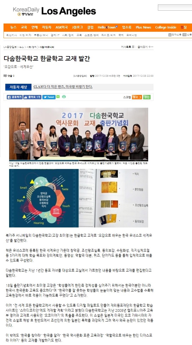[LA 중앙일보] 다솜한국학교 한글학교 교재 발간
