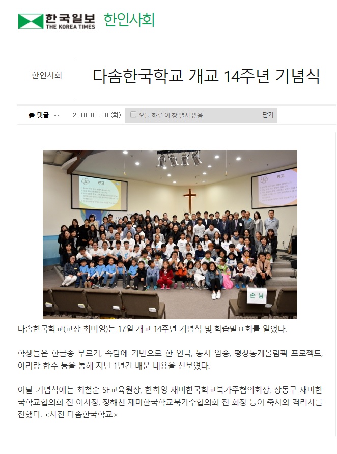 2018년 3월 20일 미주 한국일보에 게재된 개교 14주년 기념식 기사입니다.