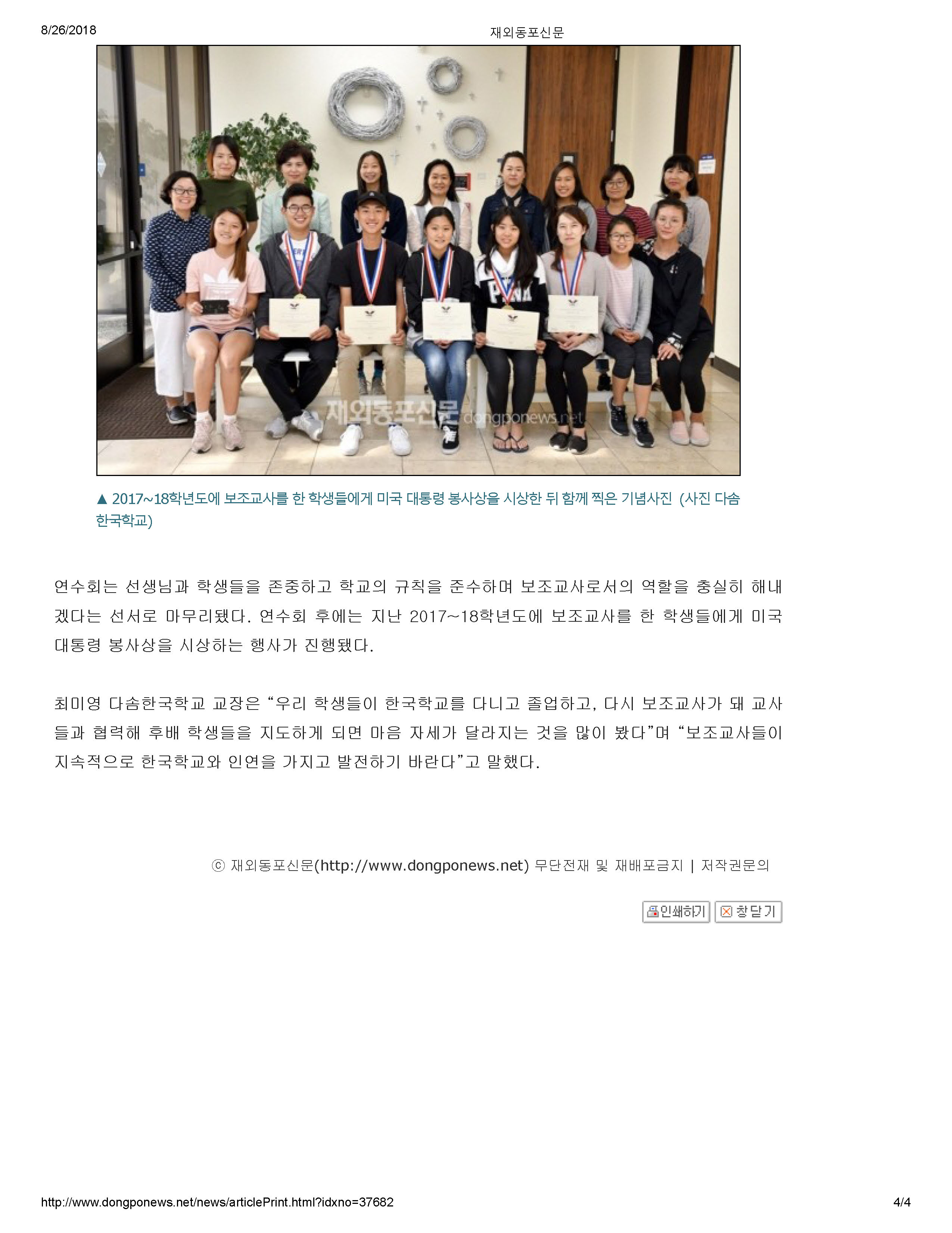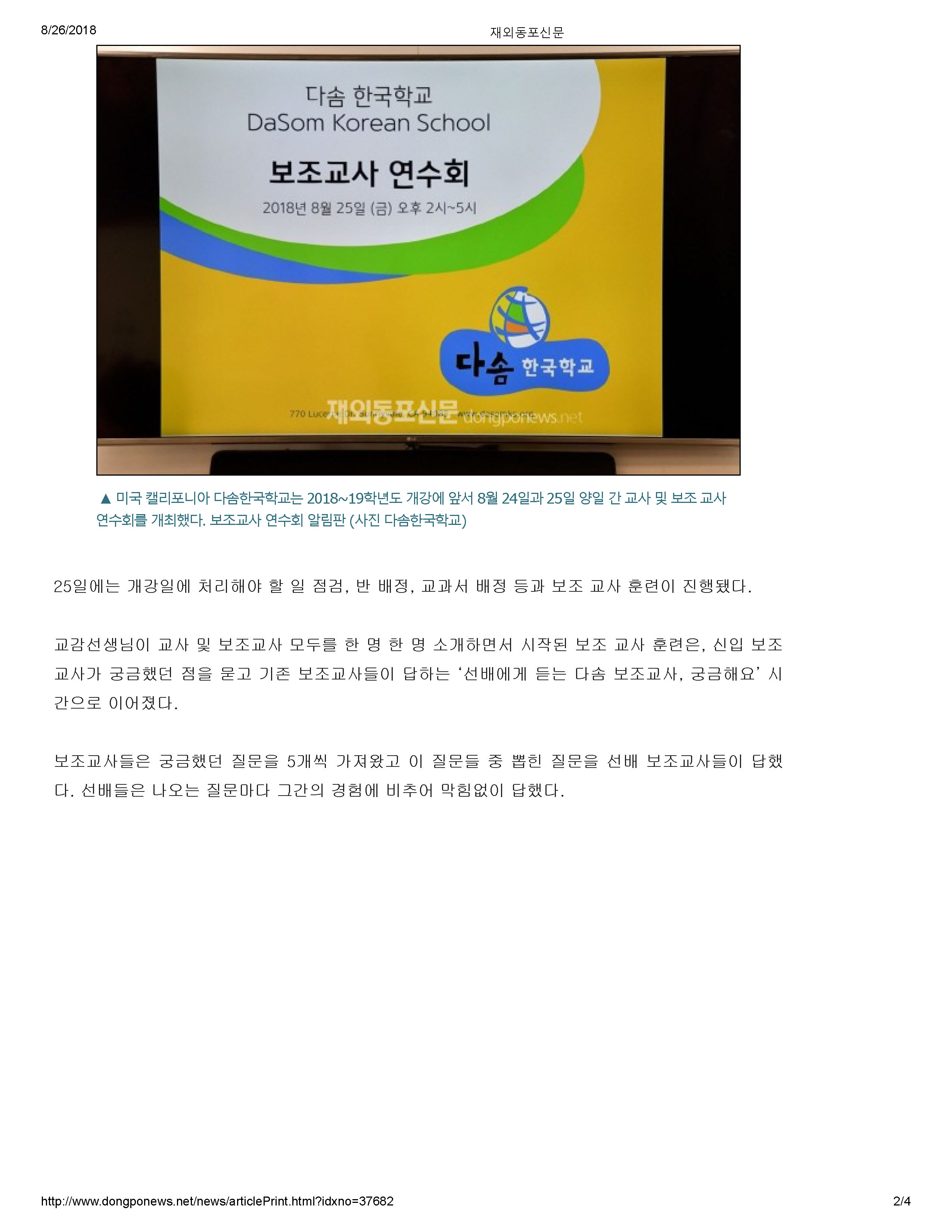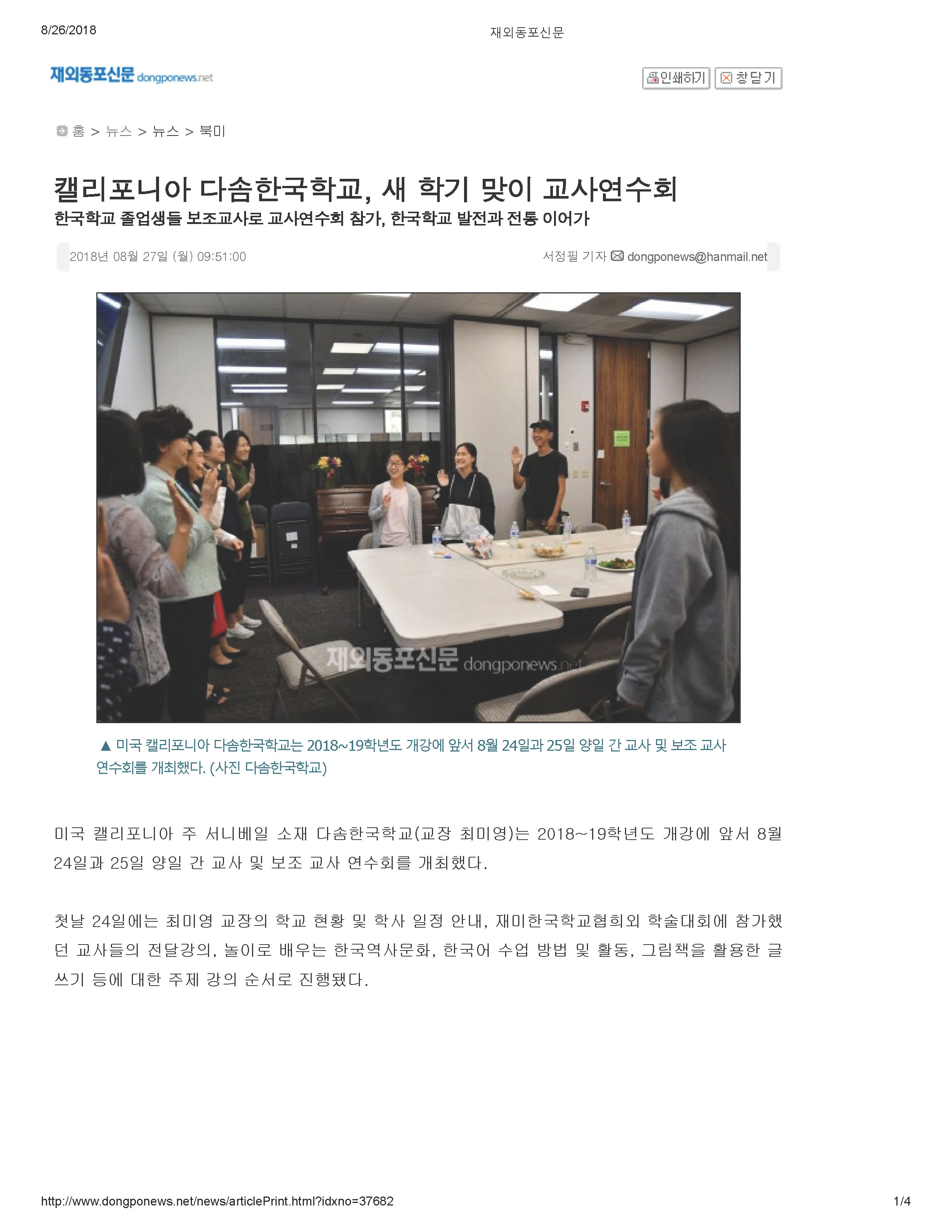 [재외동포신문]새 학기 맞이 교사연수회 지난 2018년 8월 24일과 25일에 개최된 교내 교사연수회와 보조교사 연수회에 관한 재외동포신문 기사입니다. http://www.dongponews.net/news/articleView.html?idxno=37682 Attachments: 2018_08_27_Dongponews_DasomTT.pdf[ ]608 kB Prev Next
