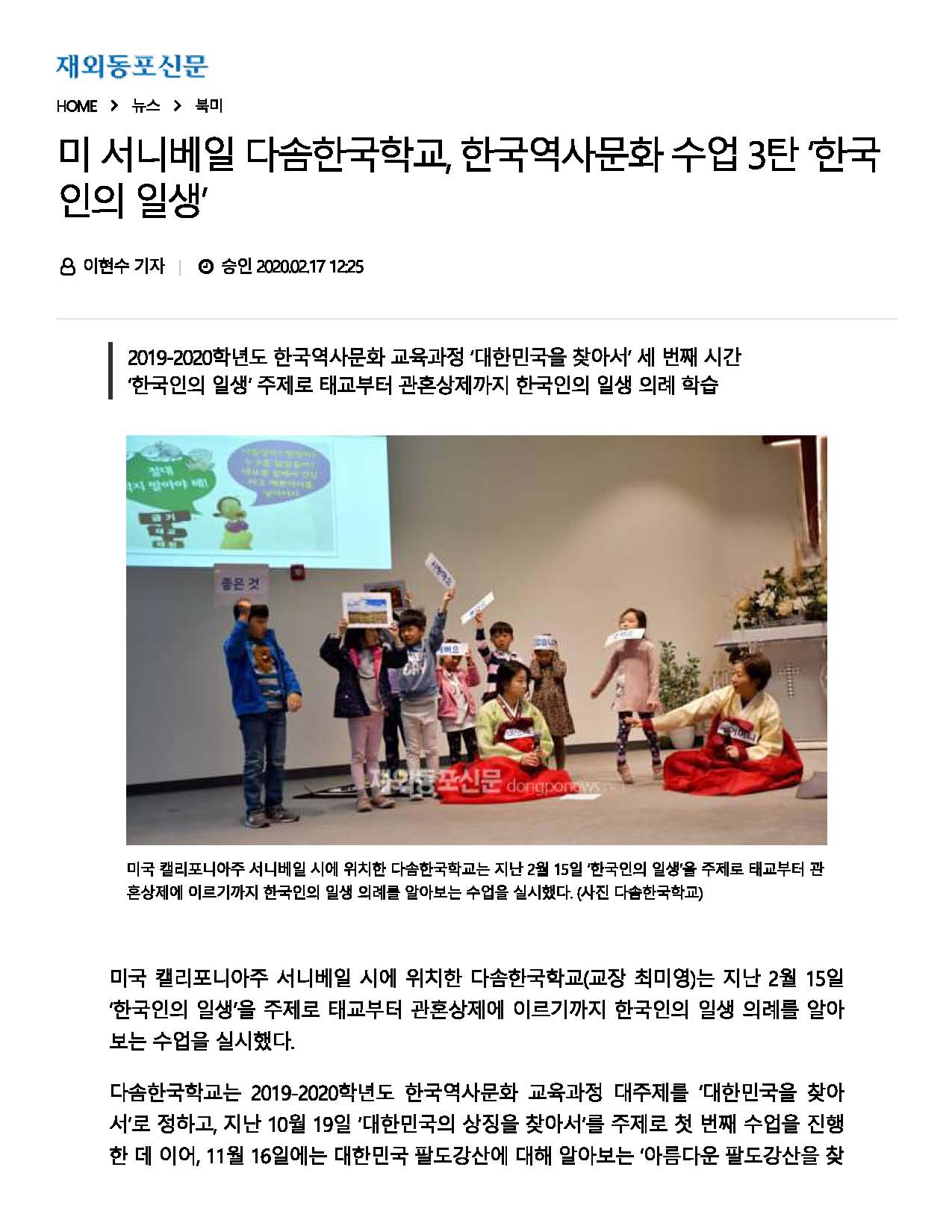 [재외동포신문] 한국역사문화 수업 '한국인의 일생' http://www.dongponews.net/news/articleView.html?idxno=41483 Attachments: 2020_02_17_Donponews_KoreanLife.pdf[ ]281 kB Prev Next