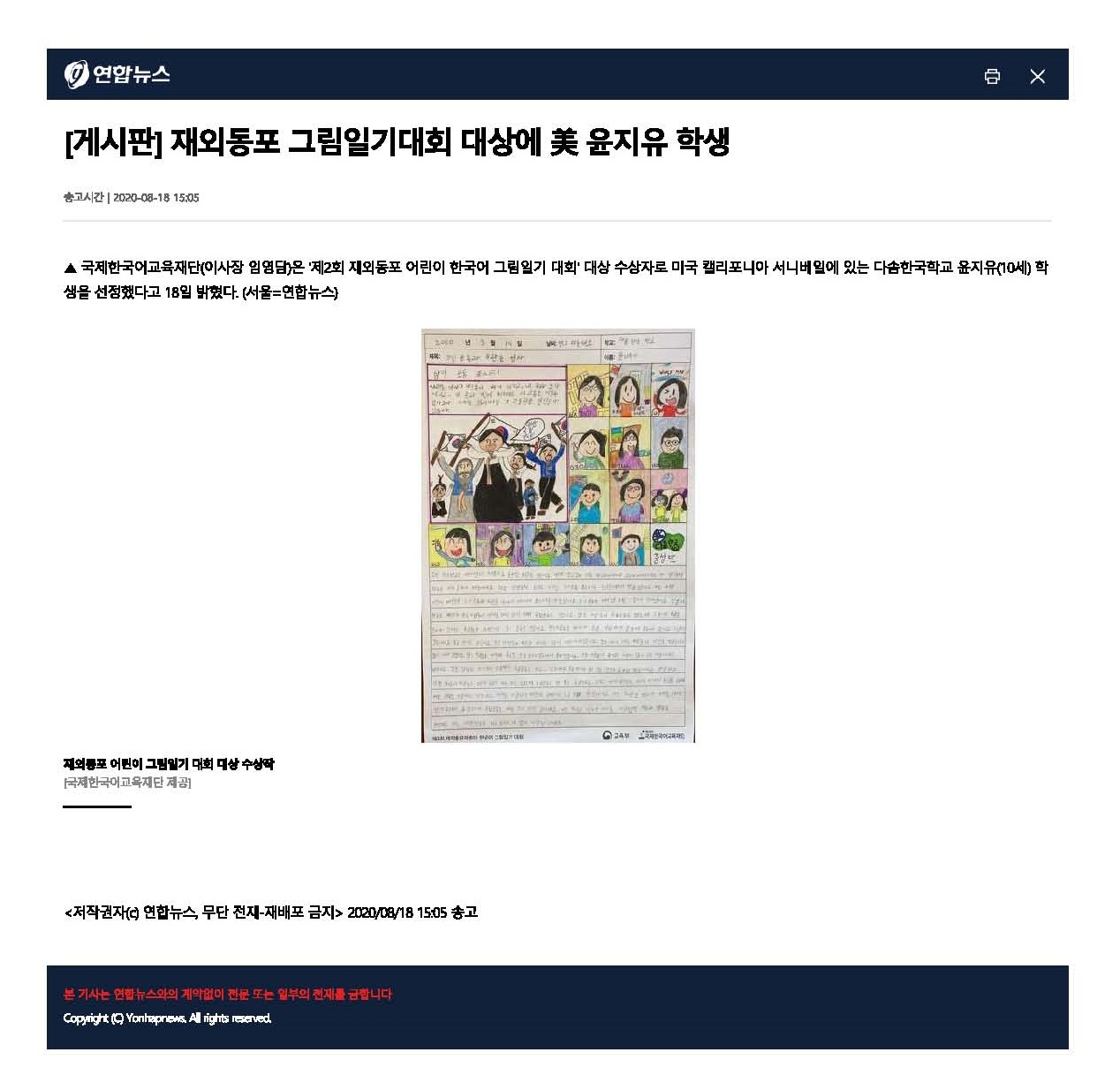 [연합뉴스]재외동포 그림일기대회 대상에 美 윤지유 학생