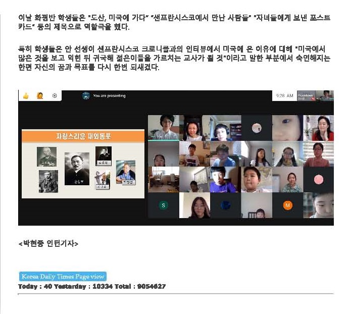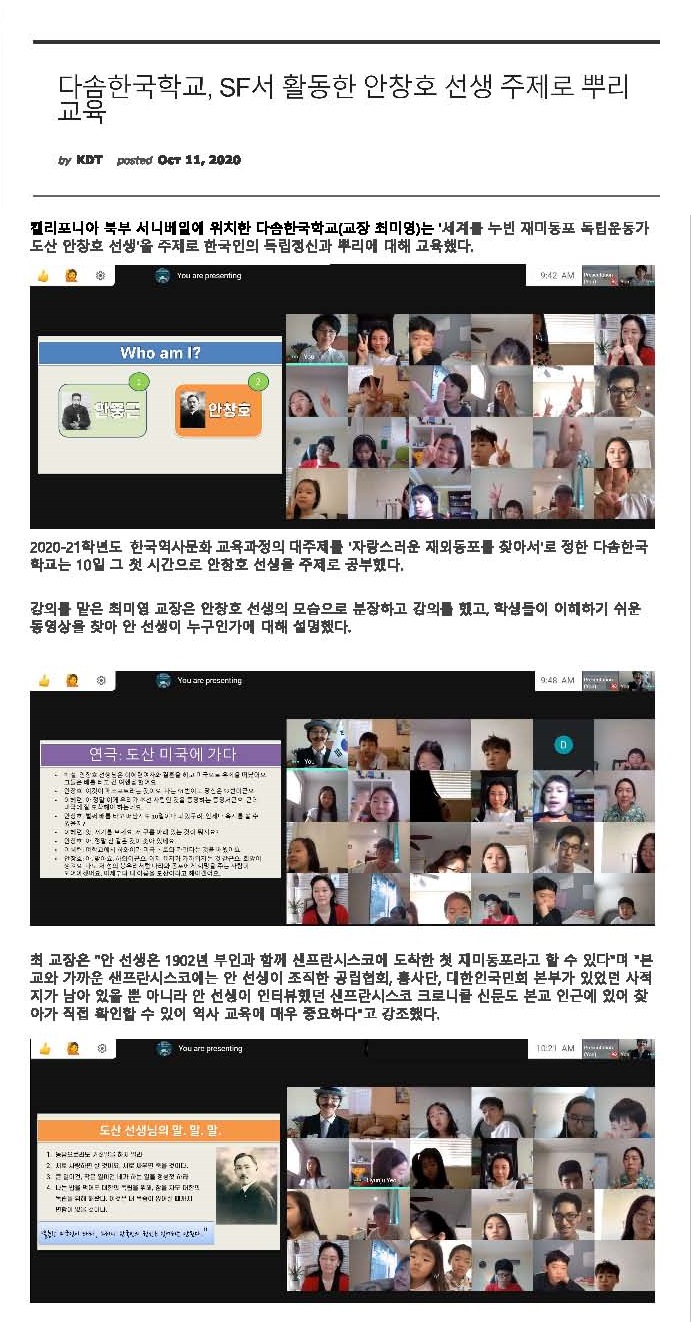 [코리아데일리] SF서 활동한 안창호 선생 주제로 뿌리 교육 https://koreadailytimes.com/index.php?mid=social&document_srl=58701 Prev Next