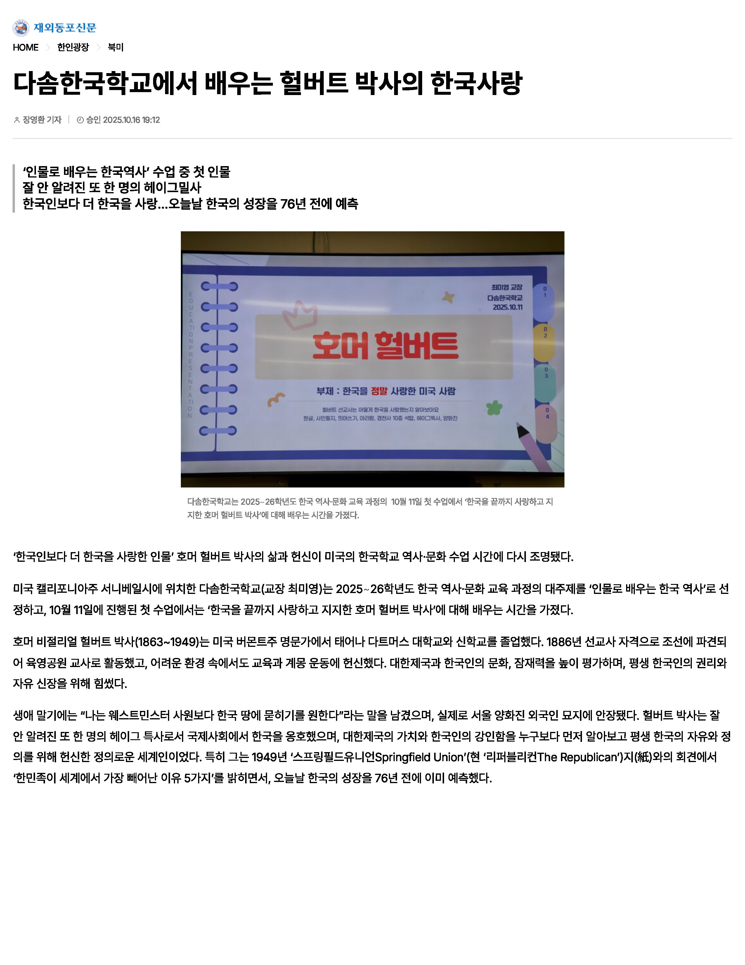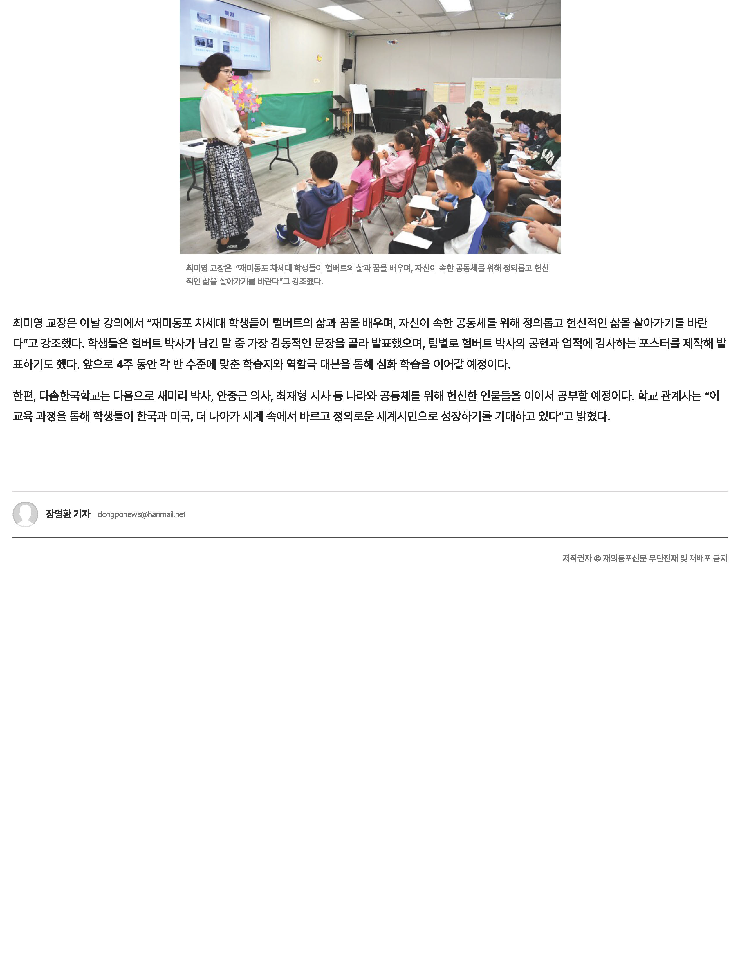 [재외동포신문] 다솜한국학교에서 배우는 헐버트 박사의 한국사랑