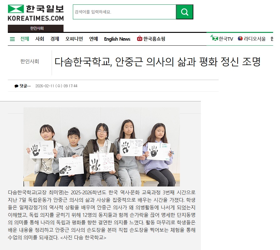 [한국일보] 다솜한국학교, 안중근 의사의 삶과 평화 정신 조명